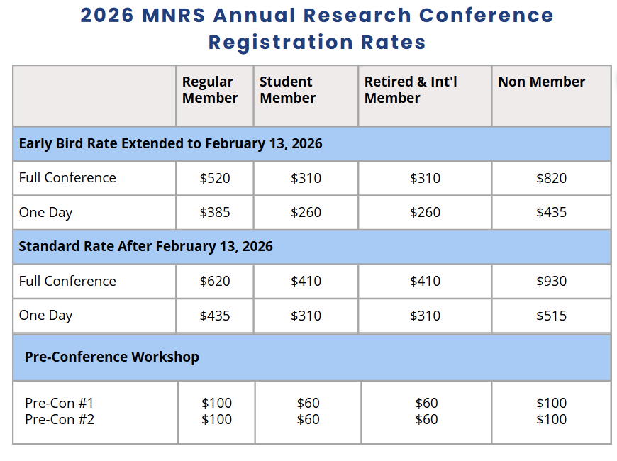 As part of MNRS’s 50th Anniversary celebration, you can recognize a Champion—someone who inspired, supported, or shaped your professional journey. For a minimum $50 donation, your Champion’s name will be displayed in a slideshow during the 2026 Annual Research Conference.