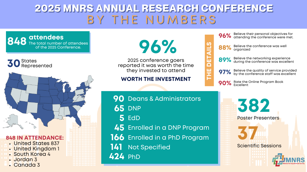 Each year, MNRS hosts a state-of-the-art conference that draws attendees from all over the United States. This annual event is where members and non-members can come and showcase their work and network with leaders in the field, colleagues, and friends. From current students to seasoned veterans, MNRS can be home to anyone with a passion for nursing research!